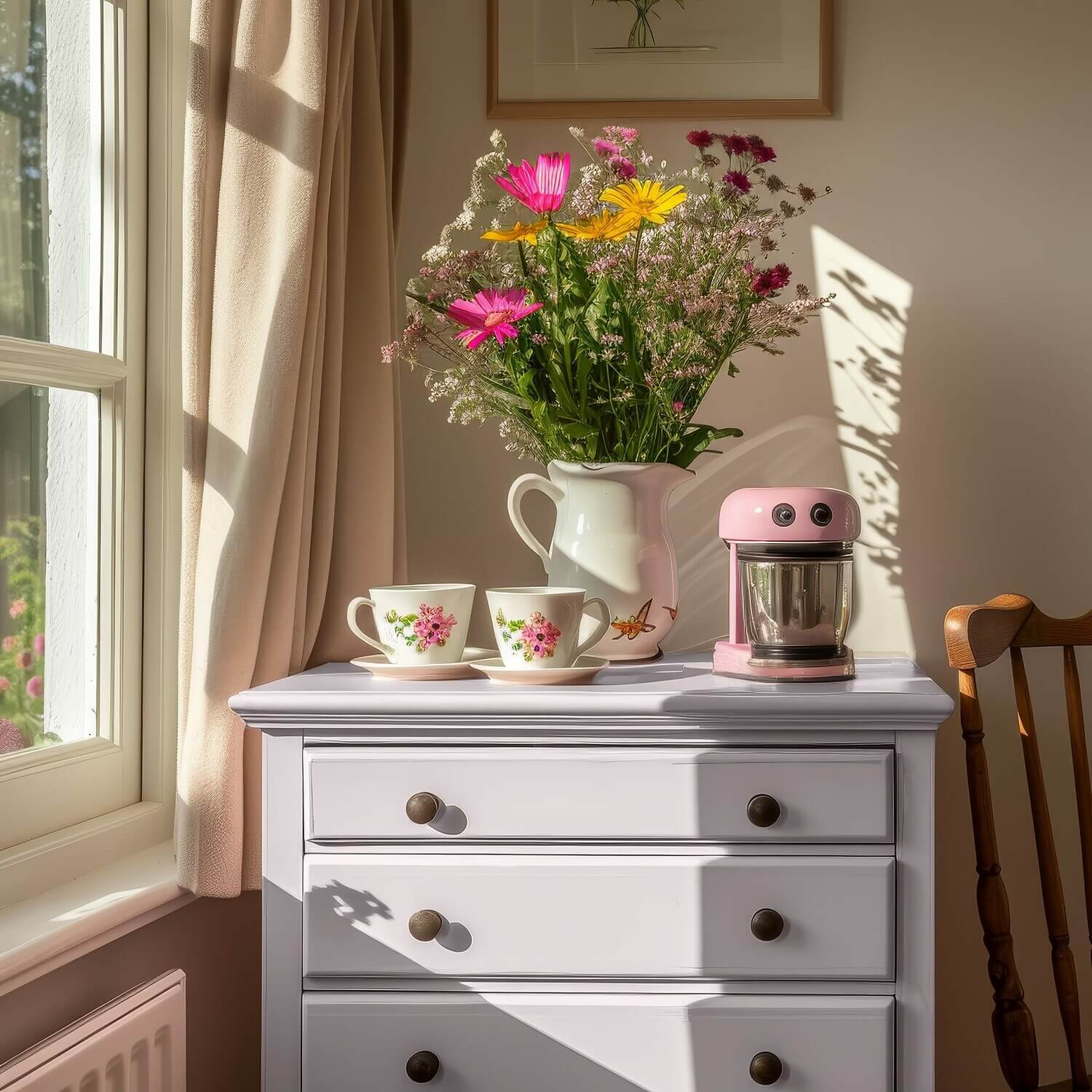 - Die natürliche, matte Optik: Kreidefarbe unterscheidet sich in der Oberfläche von anderen Farben. Die kleinen Kreidepartikel in der Farbe reflektieren das Licht in ganz spezieller Weise. Dadurch entsteht die matte, samtig wirkende Optik, die sich nur mit Kreidefarbe erzielen lässt und die gerade die weißen Farbtöne strahlen lässt.