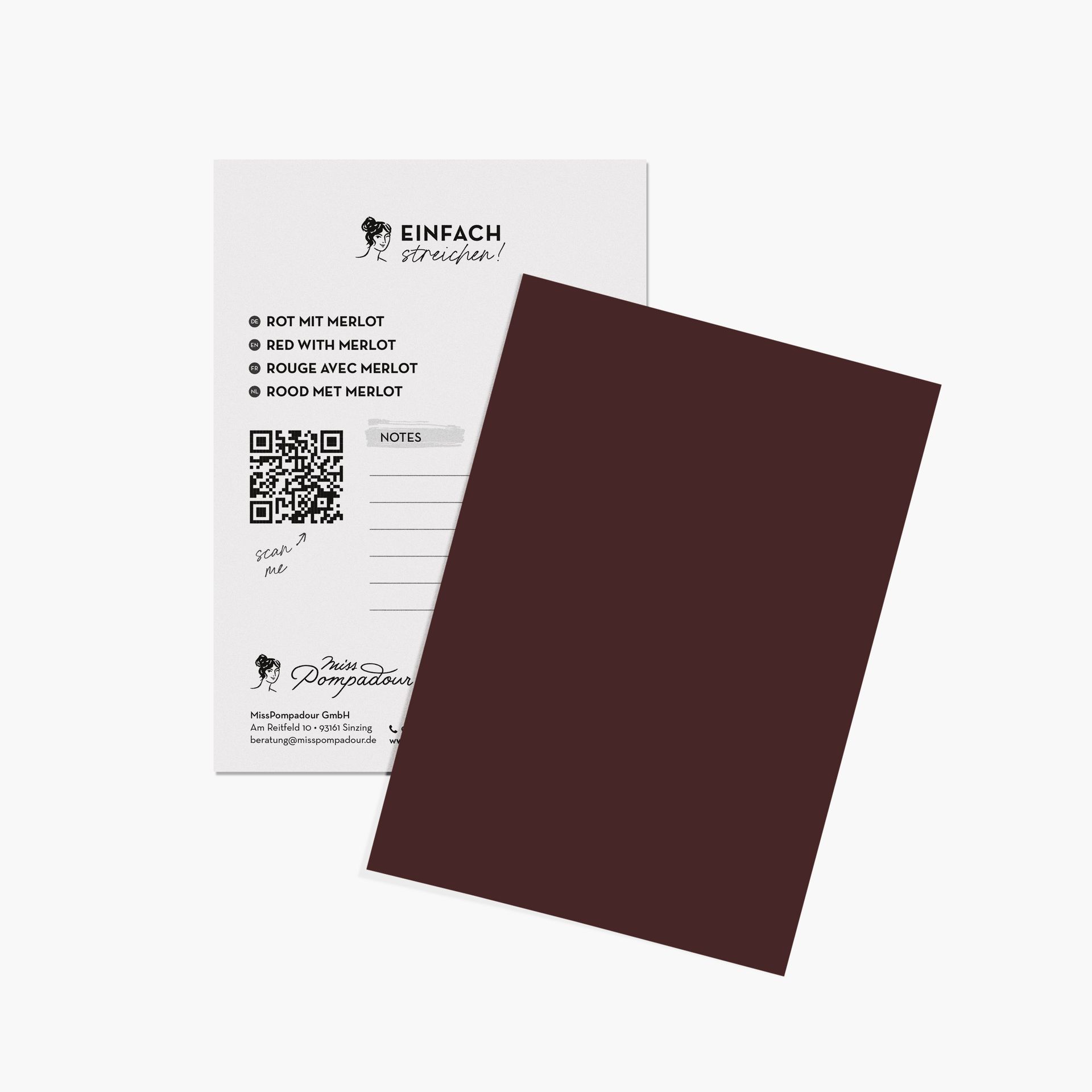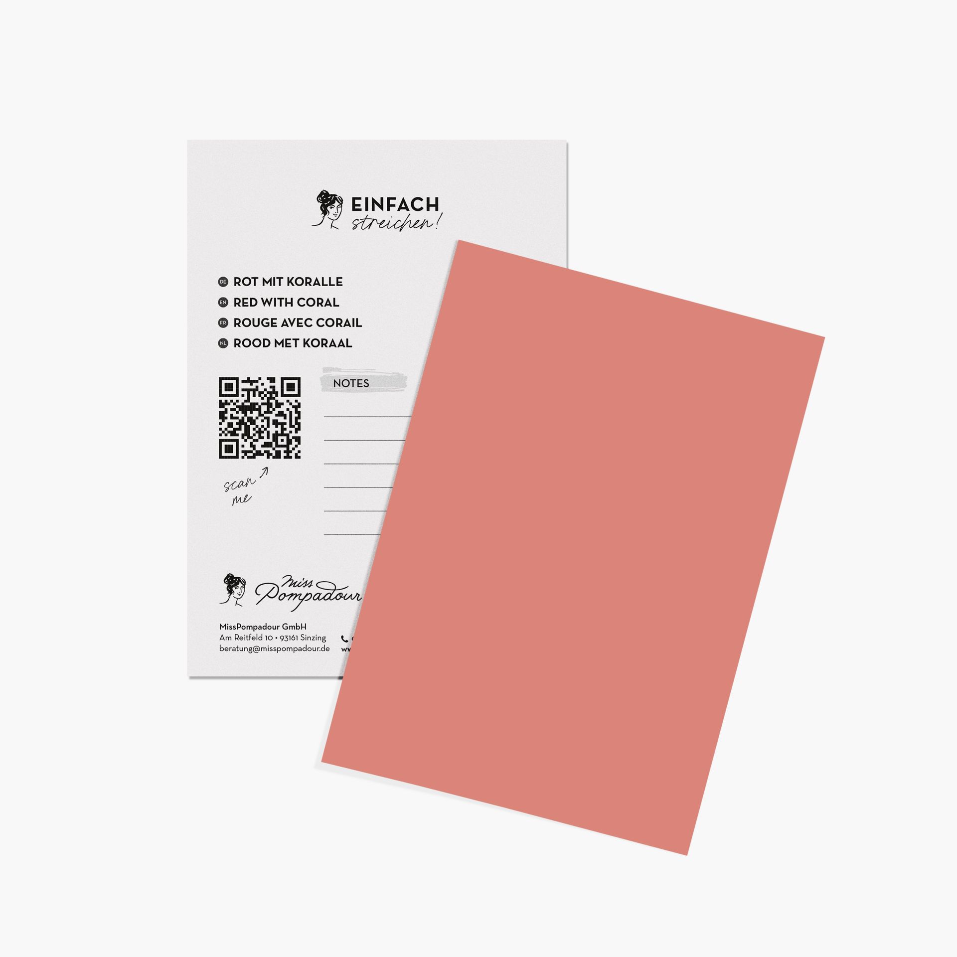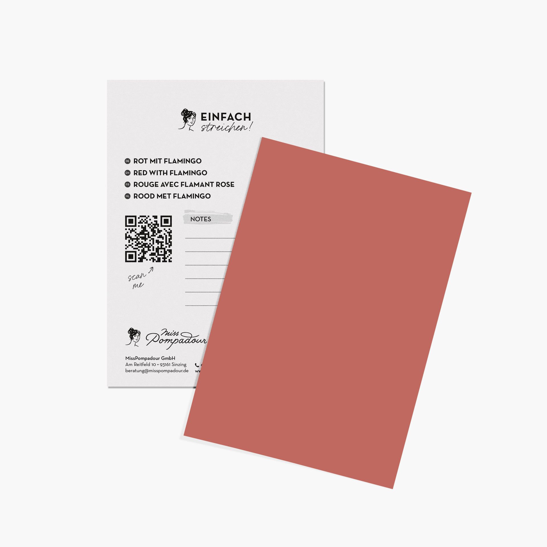 Willst du den Rotton finden, der perfekt in dein Zuhause passt, bestellst du dir am besten einen Farbkartensatz von MissPompadour. Die Karten sind postkartengroß und einzeln entnehmbar. So kannst du sie überall anheften und auf diese Weise die einzelnen Farbtöne bei jeder Beleuchtung begutachten.