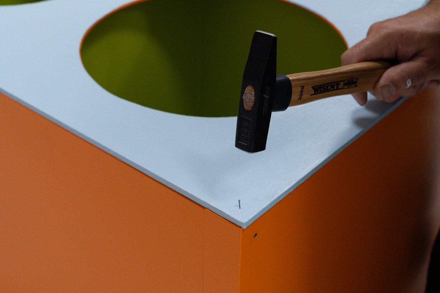Front auf die Vorderseite des Regals befestigen und anschließend die Nagelköpfe überstreichen.