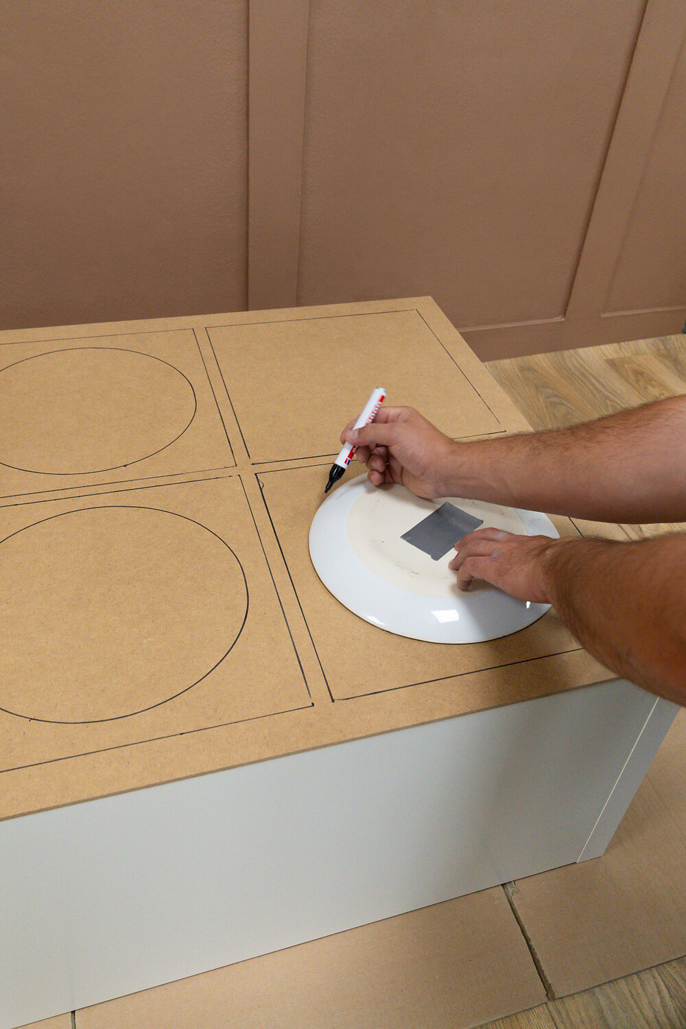 Beim Umdrehen der Platte hast du jetzt eine perfekte Skizze der Regalfachpositionen. Nimm den Teller, platziere ihn mittig auf der Vorzeichnung und zeichne einen Kreis entlang des Randes.