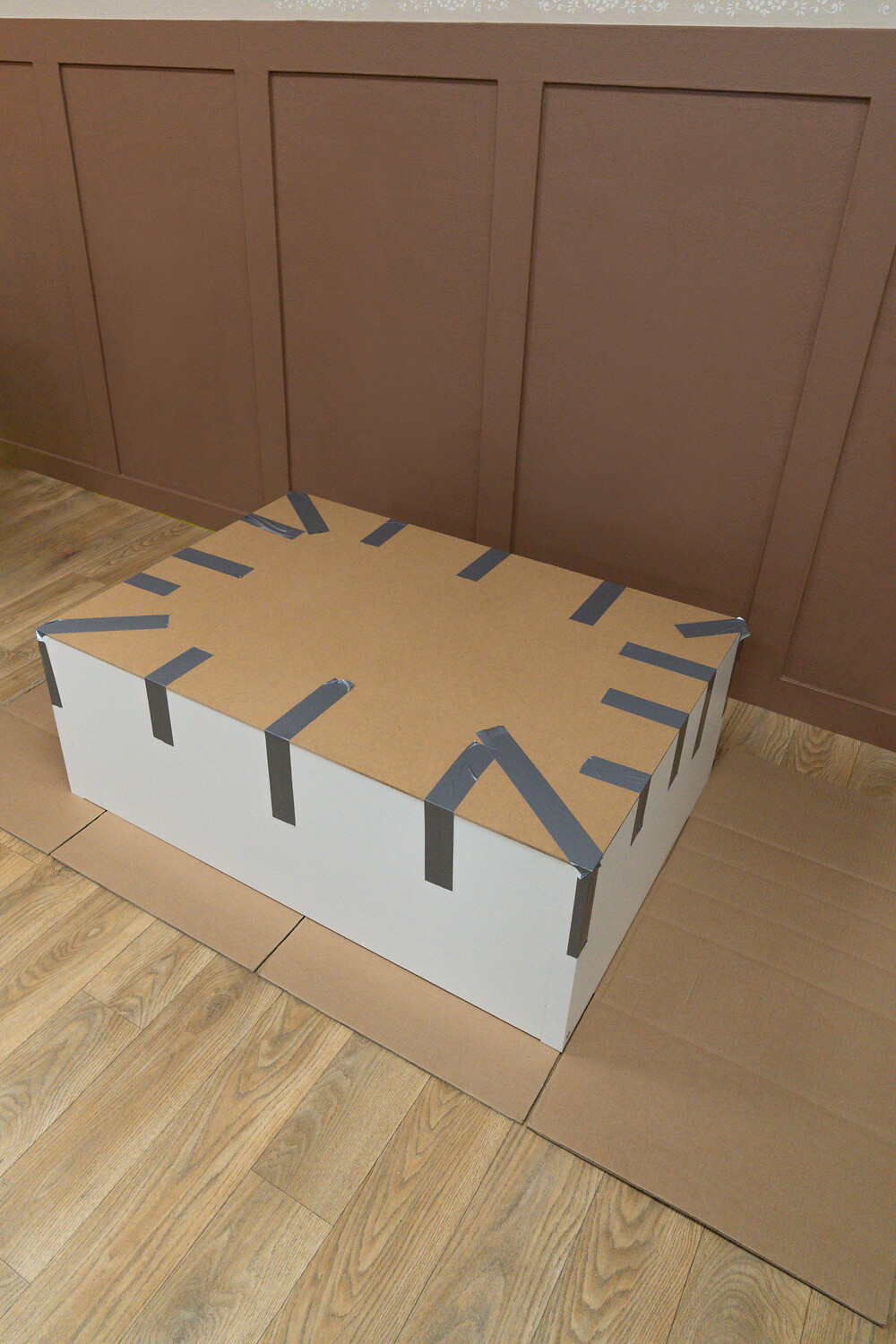MDF-Platte passend auf das Kallax-Regal legen und mit Gewebeband befestigen.