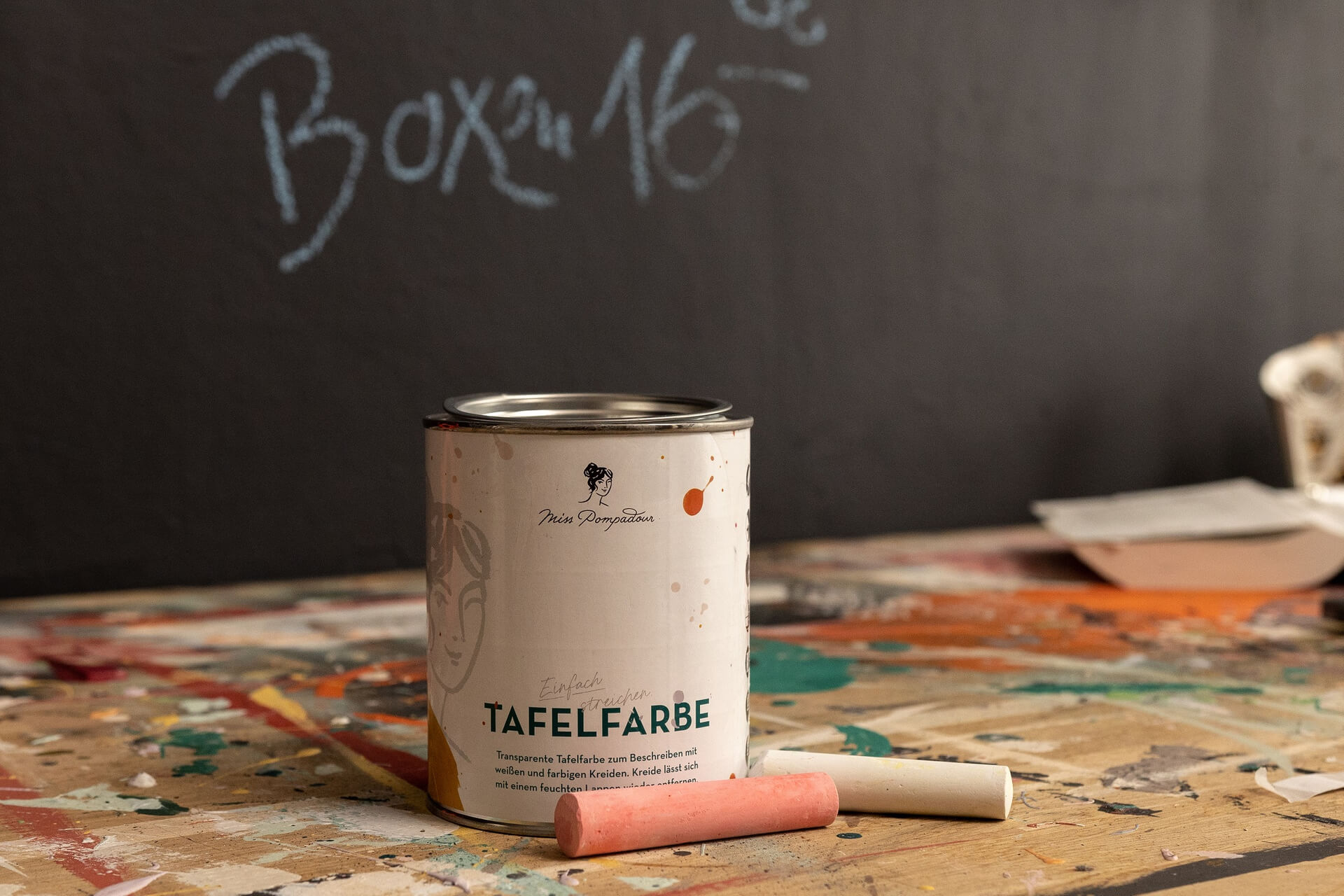 Was für ein grenzenloses Kreidevergnügen entsteht doch mit der MissPompadour Tafelfarbe! Mit dieser Farbe schaffst du dir wirklich kreative Freiräume. Überall wo die Tafelfarbe aufgetragen ist, kannst du mit weißer oder farbiger Kreide nach Herzenslust auf der Wand, der Tür, oder dem Möbelstück malen. Anschließend kannst du mit einem feuchten Lappen alles wieder abwischen. Aber das Beste ist: Diese Farbe ist vollkommen transparent. Das bedeutet keine schwarze oder grüne Wand mehr, sondern du schreibst praktisch direkt auf deiner Wandfarbe. Die Tafelfarbe von MissPompadour kann auf glatte Wände, auf Türen oder Möbel gestrichen werden. Ganz gleich, ob die Untergründe aus Holz, Kunststoff oder Metall sind. Es reicht, wenn die Oberflächen so glatt sind, dass man sie später mit Kreide problemlos beschreiben und bemalen kann.