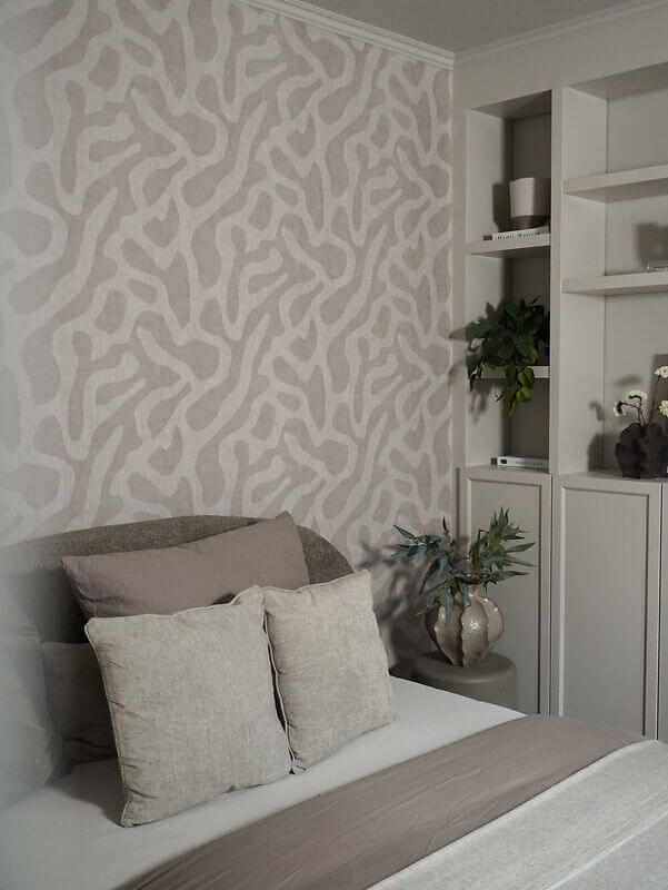 Lori spielt mit geschmeidigen Abstufungen feiner, gemütlicher Greige-Töne. Die geschwungenen, organischen Formen erinnern an Reflexe fließenden Wassers. Sie erzählen von Bewegung, die nicht drängt, sondern einlädt in ein leises Spiel aus Formen und Farben. Sie verbinden sich geschmeidig wie Yin und Yang und verwandeln deinen Wohlfühlort in eine Oase behaglicher Lebendigkeit. villa_karole tapeziert die Vliestapete Lori im Gästezimmer und schafft so einen besonderen Hingucker. Durch den Namen Lori wird sie an ihre Oma Lorchen erinnert.