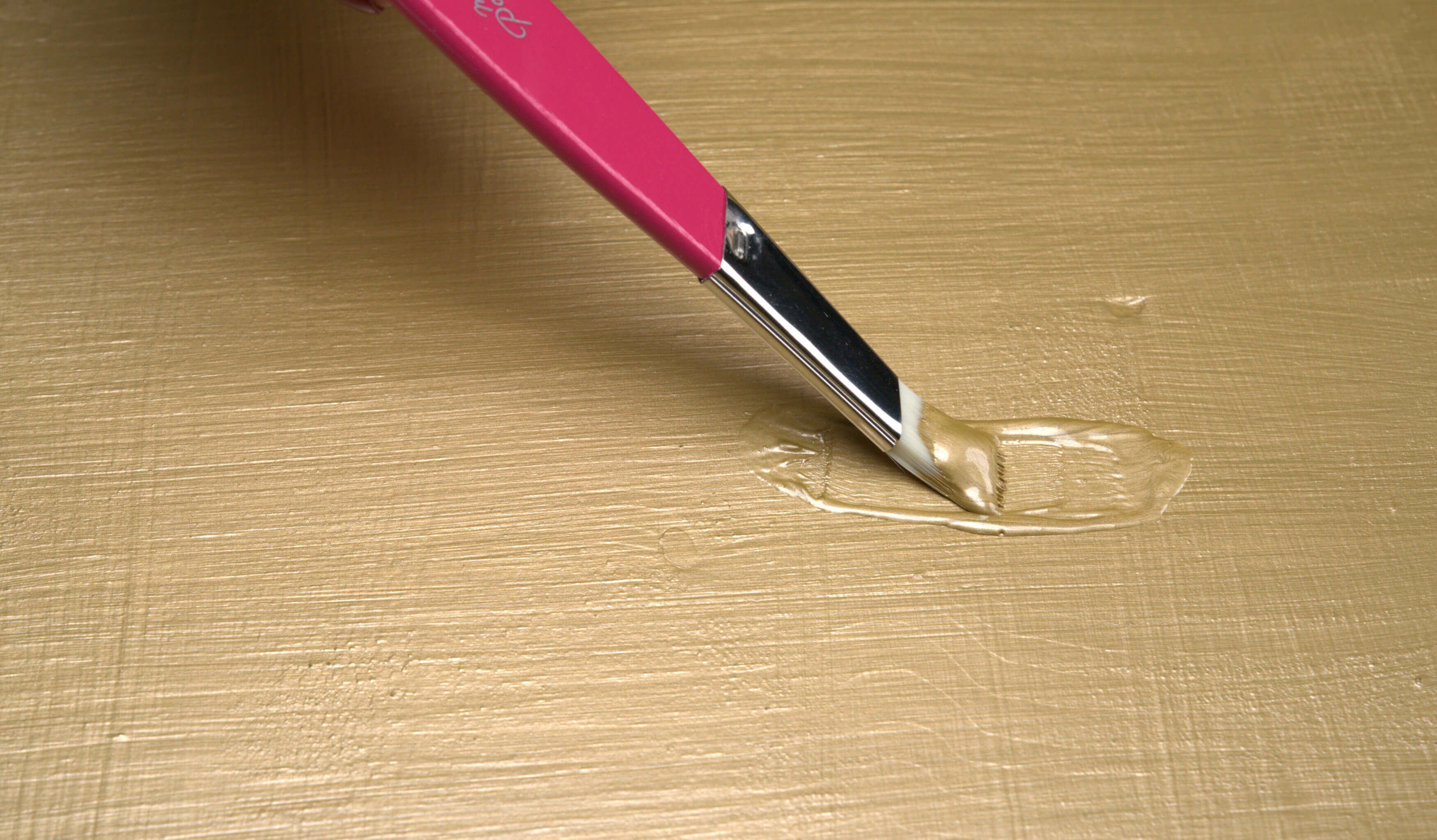 Nun kannst du den Effektlack auftragen. Er muss zu Beginn besonders gut verrührt werden, damit sich die Pigmente gleichmäßig verteilen. Für die Verarbeitung verwendest du entweder Pinsel oder Rolle. Streiche den Lack sehr dünn Schicht für Schicht auf, dann erreichst du den schönsten Effekt. Du solltest mindestens 2 Schichten auftragen. Lass den Goldlack nach dem ersten Anstrich mindestens 7 Stunden trocknen, danach kommt die zweite Schicht. Werden die gestrichenen Flächen später sehr strapaziert, kannst du sie zusätzlich mit MissPompadour Zum Versiegeln stabilisieren.