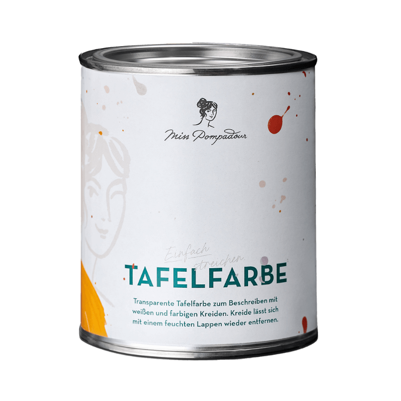 MissPompadour Tafelfarbe ist eine universell einsetzbare wasserbasierte transparente Wandtafelfarbe für viele Untergründe. Für individuelle und beschreibbare Tafeln in der Lieblingsfarbe.
